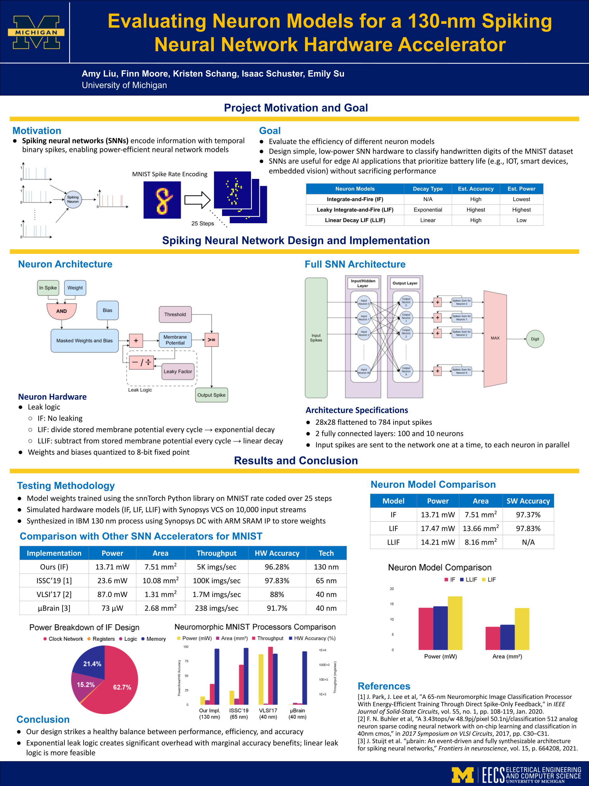 I am a VLSI Master’s student at the University of Michigan. I am currently working as a graduate student research assistant in the M-Bits Research Group on spiking neural network algorithms for energy efficient automotive vision. In the past I’ve worked on efficient hardware for machine learning at MemryX and the Wei Lu Nanoelectronics Group.